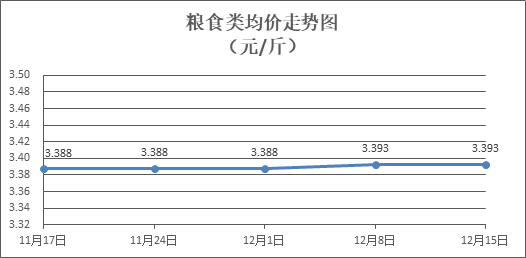 粮食类商品价格保持稳定。所监测的4种粮食类商品价格均持平,零售均价为每斤3.393元。其中:油粘米、富强粉零售均价分别为每斤3.52元、3.36元,环比均持平。