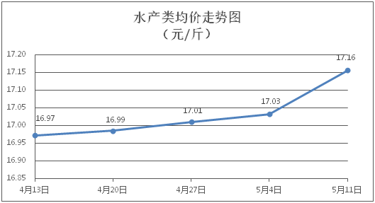 水产类商品价格总体略涨。所监测的9种水产商品价格波动情况为4涨2跌3平,综合均价为每斤17.16元,环比上涨0.72%。其中:草鱼、鲫鱼、罗非鱼、基围虾零售均价分别为每斤11.18元、14.24元、9.10元、30.43元,环比分别上涨0.36%、上涨0.64%、上涨0.66%、下降0.07%。