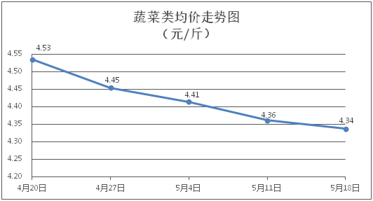 据本市21家农贸市场监测数据显示,上周(5月12日至5月18日)市场上各类“菜篮子”商品供应充足,所监测的7大类“菜篮子”商品价格环比总体表现为4涨3跌。其中:粮油类商品价格基本平稳,肉菜类商品价格总体略降,禽蛋类、水果类、水产类商品价格有所上涨。