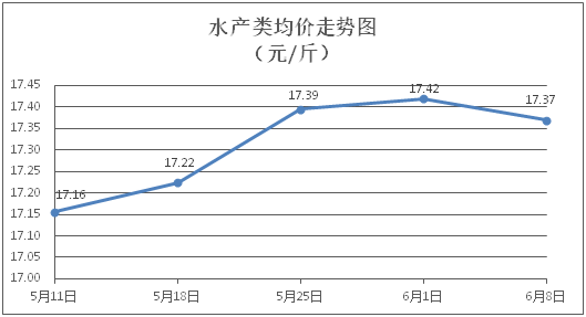 水产类商品价格有所回落。所监测的9种水产商品价格波动情况为3涨4跌2平,综合均价为每斤17.37元,环比下降0.29%。其中:草鱼、鲫鱼、罗非鱼、基围虾零售均价分别为每斤11.20元、14.29元、9.12元、30.46元,环比分别下降0.09%、下降0.35%、上涨0.22%、下降0.88%。
