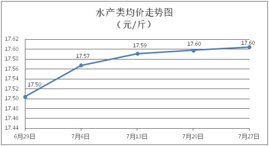 水产类商品价格窄幅盘整。所监测的9种水产商品价格波动情况为4涨4跌1平,综合均价为每斤17.60元,环比上涨0.04%。其中:草鱼、鲫鱼、鳙鱼、基围虾零售均价分别为每斤11.32元、14.24元、10.75元、30.80元,环比分别上涨0.35%、下降0.14%、上涨0.47%、下降0.16%。