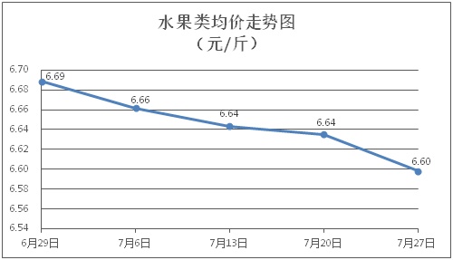 水果类商品价格总体略降。所监测的6种水果商品价格波动情况为1涨4跌1平,综合零售均价为每斤6.60元,环比下降0.55%。其中橙子、香蕉、梨零售均价分别为每斤6.54元、3.37元、5.24元,环比分别上涨1.40%、下降0.30%、下降0.95%。
