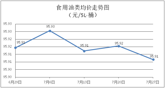 食用油类商品价格稳中有降。所监测的9种食用油(5L装)商品价格波动情况为1涨1跌7平,综合零售均价为每桶95.92元,环比下降0.01%。其中:金龙鱼花生油、金龙鱼调和油零售均价为每桶102.83元、71.24元,环比分别持平、下降0.13%。