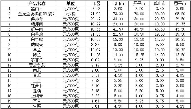 说明:1、表中价格为该地区监测点综合平均价;2、“市区”含蓬江区、江海区、新会区,价格分别采自蓬江市场、江南市场、城东市场等13家农贸市场;3、其他四个县市价格分别采自新华市场、锦江市场等8家农贸市场。