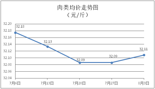 肉类商品价格微幅上涨。所监测的8种肉类商品价格波动情况为5涨3平,综合零售均价为每斤32.11元,环比上涨0.07%。其中:排骨、精瘦肉、牛肉、带骨羊肉零售均价分别为每斤30.22元、18.92元、46.54元、42.11元,环比分别上涨0.23%、上涨0.05%、上涨0.09%、上涨0.05%。