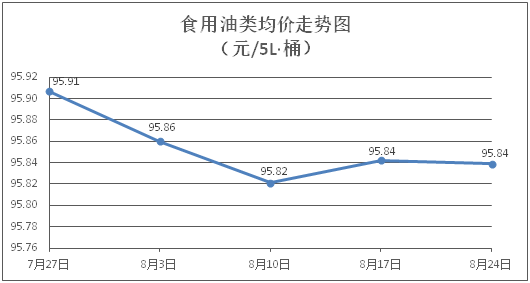 食用油类商品价格基本平稳。所监测的9种食用油(5L装)商品价格波动情况为1跌8平,综合零售均价为每桶95.84元,环比下降0.003%。其中:金龙鱼花生油、大豆油零售均价分别为每桶102.62元、61.58元,环比分别持平、下降0.05%。