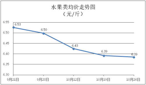 水果类商品价格窄幅盘整。所监测的6种水果商品价格波动情况为2涨2跌2平,综合零售均价为每斤6.39元,环比下降0.10%。其中橙子、香蕉、西瓜零售均价分别为每斤7.35元、2.83元、3.19元,环比分别下降0.81%、持平、上涨0.63%。