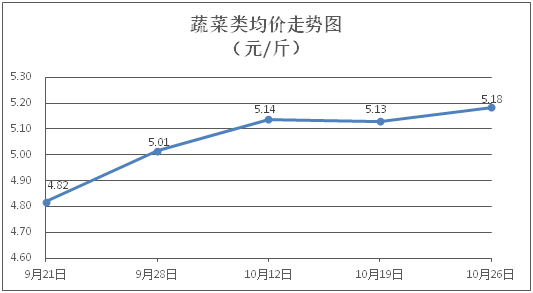 蔬菜类商品价格以涨为主。所监测的32 种蔬菜商品价格波动情况为18涨10跌4平,综合零售均价为每斤5.18元,环比上涨1.08%。其中:涨幅居前的品种包括白苋菜、黄瓜、西洋菜,零售均价分别为每斤5.08元、4.97元、6.38元,环比分别上涨5.61%、5.30%、4.93%;跌幅靠前的品种为茄子、丝瓜、青豆角,零售均价分别为每斤4.27元、6.29元、5.66元,环比分别下降0.93%、0.79%、0.70%。