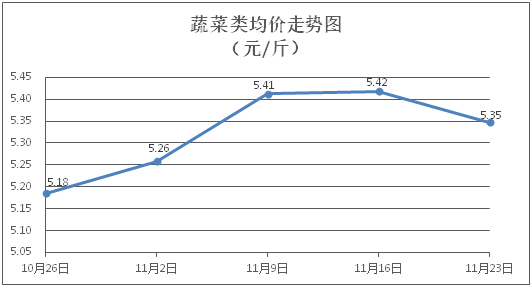 蔬菜类商品价格普遍下降。所监测的蔬菜商品价格波动情况为6涨23跌3平,综合零售均价为每斤5.35元,环比下降1.30%。其中:涨幅居前的品种包括苦瓜、蒜苔、大白菜,零售均价分别为每斤6.26元、8.80元、3.30元,环比分别上涨3.81%、1.97%、0.92%;跌幅靠前的品种为莴笋、黄瓜、西洋菜,零售均价分别为每斤5.83元、4.89元、5.88元,环比分别下降7.17%、5.78%、4.70%。