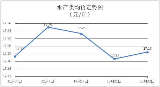 水产类商品价格窄幅盘整。所监测的水产商品价格波动情况为4涨3跌2平,综合均价为每斤17.18元,环比上涨0.10%。其中:草鱼、鲫鱼、鳙鱼、基围虾零售均价分别为每斤11.43元、13.93元、10.65元、28.08元,环比分别下降0.26%、上涨0.51%、上涨0.38%、下降0.18%。