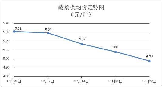 据本市21家农贸市场监测数据显示,上周(12月22日至12月28日)市场上各类“菜篮子”商品供应充足,所监测的7大类“菜篮子”商品价格环比总体表现为3涨4跌。其中:粮油类、水产类商品价格总体略涨,肉禽蛋类、蔬果类商品价格略有下降。