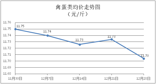 禽蛋类商品价格小幅波动。所监测的禽蛋类商品价格波动情况为1涨1跌3平,综合零售均价为每斤11.70元,环比下降0.26%。其中:白条鸡、白条鸭零售均价分别为每斤20.76元、15.31元,环比分别下降0.81%、上涨0.13%;鸡蛋、咸鸭蛋零售均价分别为每斤6.33元、8.93元,环比均持平。