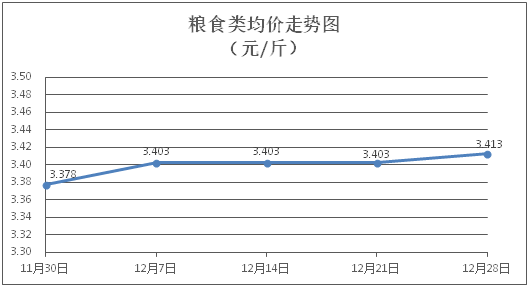 粮食类商品价格稳中有涨。所监测的粮食类商品价格波动情况为1涨3平,综合零售均价为每斤3.413元,环比上涨0.29%。其中:丝苗米、面粉零售均价分别为每斤3.54元、3.38元,环比分别持平、上涨1.20%。