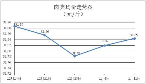 肉类商品价格总体略涨。所监测的肉类商品价格波动情况为4涨2跌2平,综合零售均价为每斤31.85元,环比上涨0.08%。其中:排骨、精瘦肉、牛肉、带骨羊肉零售均价分别为每斤29.38元、18.06元、46.80元、41.60元,环比分别上涨0.17%、下降0.44%、上涨0.09%、上涨0.39%。