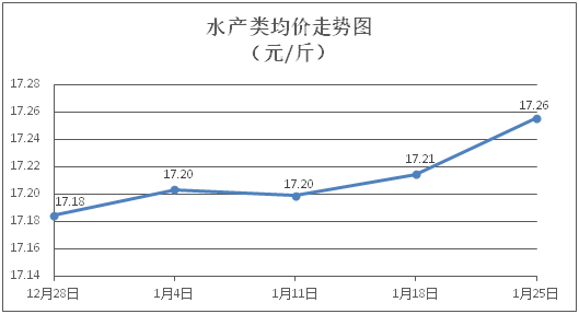 水产类商品价格微幅上涨。所监测的水产商品价格波动情况为5涨2跌2平,综合均价为每斤17.26元,环比上涨0.24%。其中:草鱼、鲫鱼、罗非鱼、基围虾零售均价分别为每斤11.46元、14.05元、8.89元、28.00元,环比分别持平、上涨0.07%、上涨0.68%、上涨0.14%。