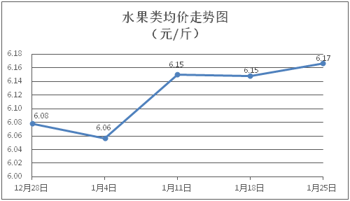 水果类商品价格小幅波动。所监测的水果商品价格波动情况为2涨3跌1平,综合零售均价为每斤6.17元,环比上涨0.30%。其中橙子、苹果、葡萄零售均价分别为每斤5.61元、7.87元、12.43元,环比分别下降0.71%、下降0.38%、上涨2.47%。