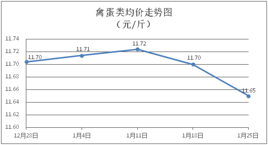 禽蛋类商品价格略有下降。所监测的禽蛋类商品价格波动情况为1涨3跌1平,综合零售均价为每斤11.65元,环比下降0.43%。其中:白条鸡、白条鸭零售均价分别为每斤20.78元、15.31元,环比分别下降0.57%、上涨0.20%;鸡蛋、咸鸭蛋零售均价分别为每斤6.35元、8.82元,环比分别持平、下降0.68%。