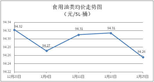 食用油类商品价格稳中略降。所监测的食用油(5L装)商品价格波动情况为2跌7平,综合零售均价为每桶94.26元,环比下降0.06%。其中:金龙鱼花生油、金龙鱼调和油零售均价分别为每桶100.01元、70.69元,环比分别下降0.39%、下降0.20%。