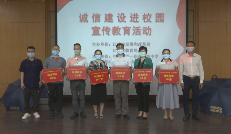 昨天下午(5月31日),由市发改局 、市教育局主办的诚信建设进校园宣传教育活动在江门一职举行。本次活动共计划在全市各学校投入“诚信雨伞”500把,供学生在校期间流动使用。雨伞上印有“弘扬传统美德 做诚实守信学生”等诚信宣传标语,旨在让学生在借用、保管、归还公共流动雨伞的过程中践行诚信理念。