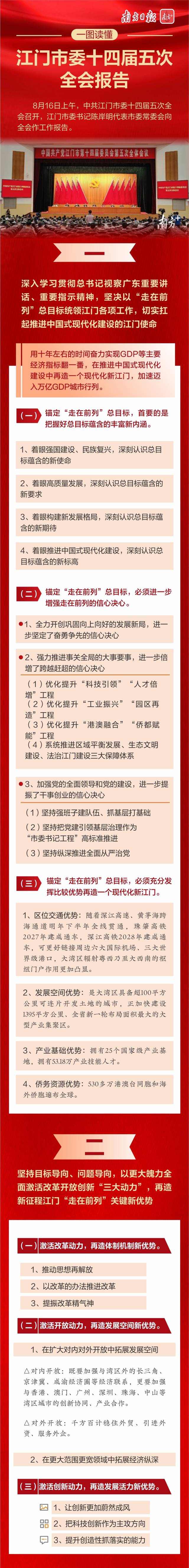 全会总结前一阶段成果,把在学习贯彻中形成的思想共识、发展思路、工作举措凝聚成为工作部署,进一步动员引领全市上下坚定不移沿着习近平总书记指引的方向,振奋精神再出发、争先进位再创业,奋力再造一个现代化新江门,为广东在推进中国式现代化建设中走在前列作出江门新的更大贡献。