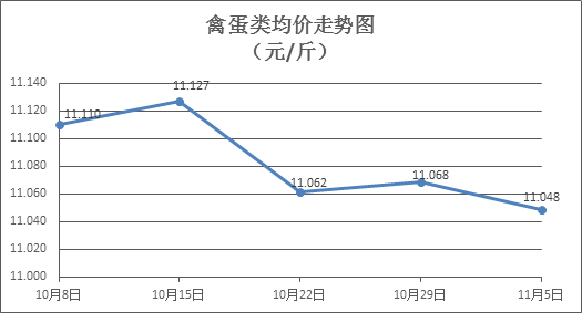 禽蛋类商品价格微幅波动。上周所监测的6种禽蛋类商品价格波动情况为3涨3跌,综合零售均价为11.048元/斤,环比下降0.18%。其中:白条鸡、白条鸭零售均价分别为每斤19.65元、15.24元,环比分别下降0.15%、下降0.97%;白壳鸡蛋、鸭蛋零售均价分别为每斤7.08元、8.18元,环比分别下降0.28%、上涨0.49%。