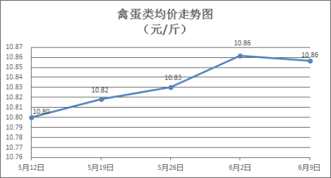 禽蛋类商品价格窄幅波动。所监测的6种禽蛋类商品价格波动情况为3涨2跌1平,综合零售均价为每斤10.86元,环比下降0.05%。其中:白条鸡、白条鸭零售均价分别为每斤19.96元、15.01元,环比分别下降0.40%、上涨0.20%;白壳鸡蛋、鸭蛋零售均价分别为每斤6.39元、7.52元,环比分别上涨0.63%、持平。