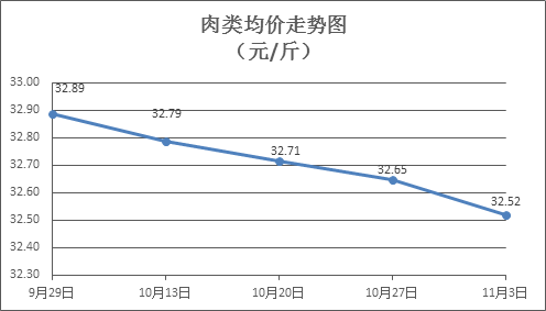 肉类商品价格持续回调。所监测的8种肉类商品价格波动情况为3涨5跌,综合零售均价为每斤32.52元,环比下降0.39%。其中:排骨、精瘦肉、腱子肉、牛腩零售均价分别为每斤32.29元、20.17元、48.80元、38.81元,环比分别上涨0.04%、下降0.27%、下降0.80%、下降1.48%。