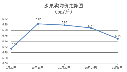 水果类商品价格有所下降。所监测的6种水果商品价格波动情况为2涨4跌,综合零售均价为每斤6.75元,环比下降0.60%。其中橙子、苹果、葡萄零售均价分别为每斤6.67元、7.42元、13.49元,环比分别下降0.55%、下降0.35%、上涨1.32%。