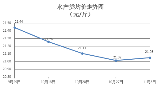 水产类商品价格总体微涨。所监测的9种水产商品价格波动情况为6涨3跌,综合均价为每斤21.05元,环比上涨0.14%。其中:草鱼、鲫鱼、罗非鱼、海虾零售均价分别为每斤11.04元、13.87元、9.05元、49.60元,环比分别下降0.04%、上涨0.81%、上涨0.73%、上涨0.47%。