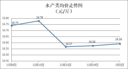 水产类商品价格小幅波动。所监测的9种水产商品价格波动情况为4涨5跌,综合均价为每斤16.59元,环比上涨0.09%。其中:草鱼、鲫鱼、罗非鱼、鳙鱼、基围虾零售均价分别为每斤11.02元、14.03元、9.09元、10.67元、29.77元,环比分别下降0.45%、上涨0.72%、下降0.22%、上涨0.09%、上涨0.74%。