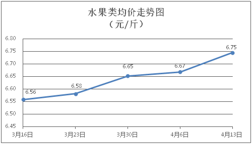 水果类商品价格小幅上涨。所监测的6种水果商品价格波动情况为5涨1跌,综合零售均价为每斤6.75元,环比上涨1.15%。其中橙子、香蕉、葡萄零售均价分别为每斤6.19元、3.34元、14.25元,环比分别上涨1.14%、上涨2.45%、上涨1.21%。