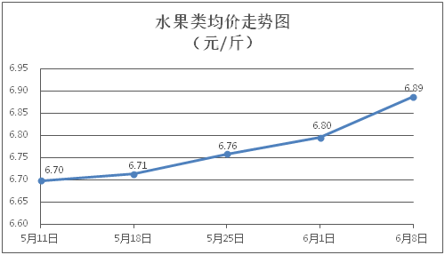 水果类商品价格小幅上涨。所监测的6种水果商品价格波动情况为3涨2跌1平,综合零售均价为每斤6.88元,环比上涨1.35%。其中橙子、香蕉、葡萄零售均价分别为每斤6.58元、3.43元、15.03元,环比分别上涨1.70%、上涨0.29%、上涨3.44%。