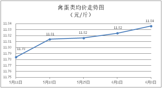 禽蛋类商品价格小幅波动。所监测的5种禽蛋类商品价格波动情况为1涨2跌2平,综合零售均价为每斤11.84元,环比上涨0.10%。其中:白条鸡、白条鸭零售均价分别为每斤20.74元、15.39元,环比分别下降0.05%、上涨0.52%;鸡蛋、鸭蛋零售均价分别为每斤6.63元、7.20元,环比分别下降0.15%、持平。