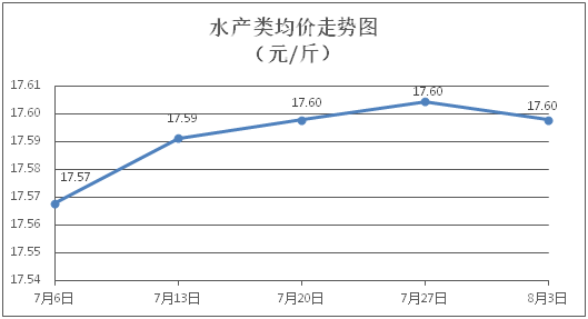 水产类商品价格窄幅盘整。所监测的9种水产商品价格波动情况为2涨2跌4平,综合均价为每斤17.60元,环比下降0.04%。其中:草鱼、鳙鱼、罗非鱼、基围虾零售均价分别为每斤11.32元、10.76元、9.02元、30.80元,环比分别持平、上涨0.09%、下降0.22%、持平。