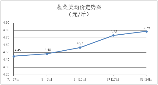 蔬菜类商品价格总体略涨。所监测的32 种蔬菜商品价格波动情况为20涨7跌5平,综合零售均价为每斤4.79元,环比上涨1.15%。其中:涨幅居前的品种包括花菜、菠菜、丝瓜,零售均价分别为每斤5.51元、7.27元、5.55元,环比分别上涨6.78%、5.67%、4.32%;跌幅靠前的品种包括苦瓜、蒜头、芥兰,零售均价分别为每斤5.13元、8.03元、5.70元,环比分别下降3.21%、1.47%、1.38%。