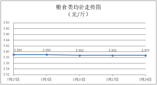 粮食类商品价格保持稳定。所监测的4种粮食类商品价格均持平,综合零售均价为每斤3.388元。其中:丝苗米、面粉零售均价分别为每斤3.51元、3.39元,环比均持平。