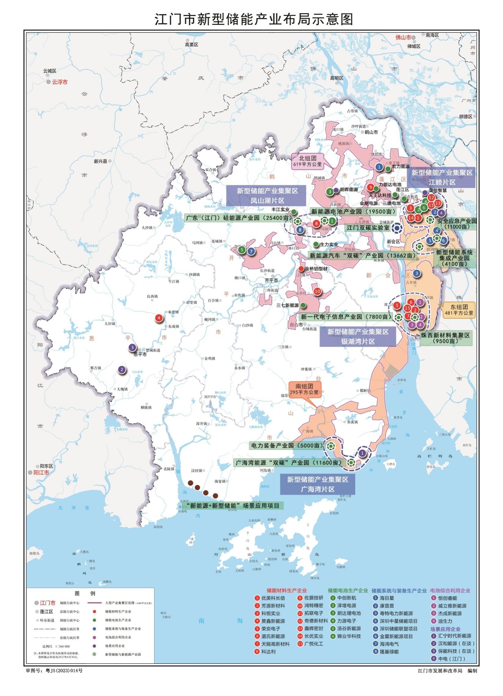 ——“四片区”:总面积超70平方公里,主要包括凤山湖、江睦、银湖湾、广海湾四个相对集中的片区。其中,凤山湖片区面积约30平方公里,包括新能源电池产业园、广东(江门)硅能源产业园,重点建设储能电池和电池组件生产基地。江睦片区面积19.1平方公里,包括安全应急产业园、新能源汽车“双碳”产业园、新型储能系统集成产业园,重点招引一批能源电子及能源管理设备制造项目,打造新型储能系统集成集聚区。银湖湾片区面积11.5平方公里,包括珠西新材料集聚区、新一代电子信息产业园,依托已布局多家电池材料和电池回收企业,重点建设新型储能电池材料生产和电池回收资源循环综合利用基地。广海湾片区面积11平方公里,包括电力装备产业园、广海湾能源“双碳”产业园,重点建设电力装备制造和新型储能场景应用基地。