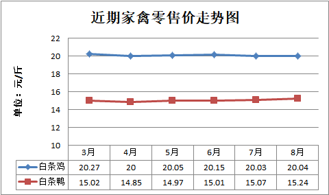 白条鸡、白条鸭零售均价分别为每斤20.04元、15.24元,环比分别上涨0.05%、上涨1.13%,同比分别上涨2.09%、下降1.74%;白壳鸡蛋、咸鸭蛋零售均价分别为每斤6.51元、9.01元,环比分别上涨1.24%、上涨0.33%,同比分别下降3.12%、上涨2.04%。