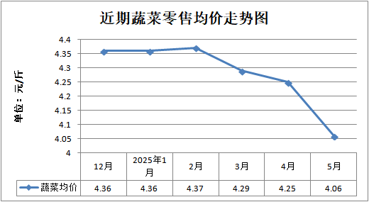 从5月监测数据看,市场肉菜价格走势不一。生猪方面,饲料成本中豆粕同比上涨1.69%,叠加端午节前养殖户压栏惜售情绪,生猪价格环比微涨0.57%。水产品方面,淡水鱼受养殖周期影响,价格波动不大,海产品因休渔期供应减少,价格有所上升。蔬菜方面,高温天气利于生长,总体供应充足,价格环比下降4.47%。