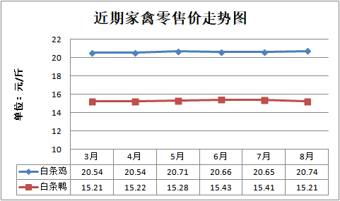 白条鸡、白条鸭零售均价分别为每斤20.74元、15.21元,环比分别上涨0.44%、下降1.30%,同比分别上涨3.49%、下降0.20%;鸡蛋、咸鸭蛋零售均价分别为每斤6.37元、9.10元,环比分别下降2.45%、下降0.55%,同比分别下降2.15%、上涨1.00%。