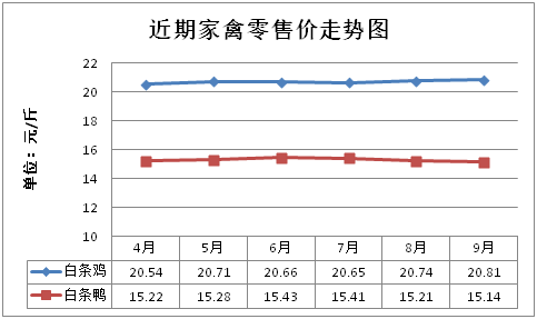 白条鸡、白条鸭零售均价分别为每斤20.81元、15.14元,环比分别上涨0.34%、下降0.46%,同比分别上涨3.33%、下降1.30%;鸡蛋、咸鸭蛋零售均价分别为每斤6.36元、9.03元,环比分别下降0.16%、下降0.77%,同比分别下降2.45%、下降0.22%。