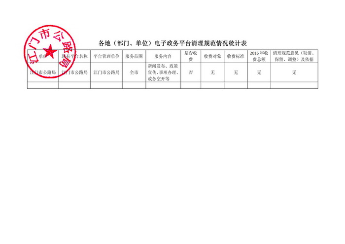 根据贵局《转发广东省发改委和改革委 广东省经济和信息化委关于进一步清理规范电子政务平台收费及有关问题的通知》(江发改费管〔2017〕374号)要求,经核查,我局无此类电子政务平台收费。