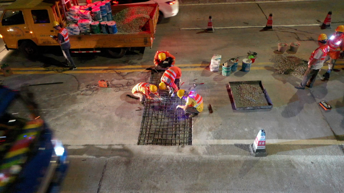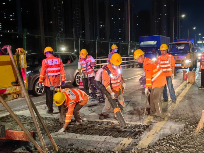 近期,“龙舟水”暴雨频发,为防止雨水渗入梁体侵蚀破坏桥梁,市区公路事务中心采用水泥混凝土路面修补胶(弹性环氧修补胶),拌和出高强度的环氧混凝土对桥面开展修复工作。自5月30日起,组织应急维修队伍在夜间22时至凌晨5时车流量较少时段错峰抢修施工,完成部分破损桥面铺装修复,有效做好安全防范,保障桥梁安全畅通。截至6月6日,该中心累计出动机械车辆30台班、应急维修人员80余人次。