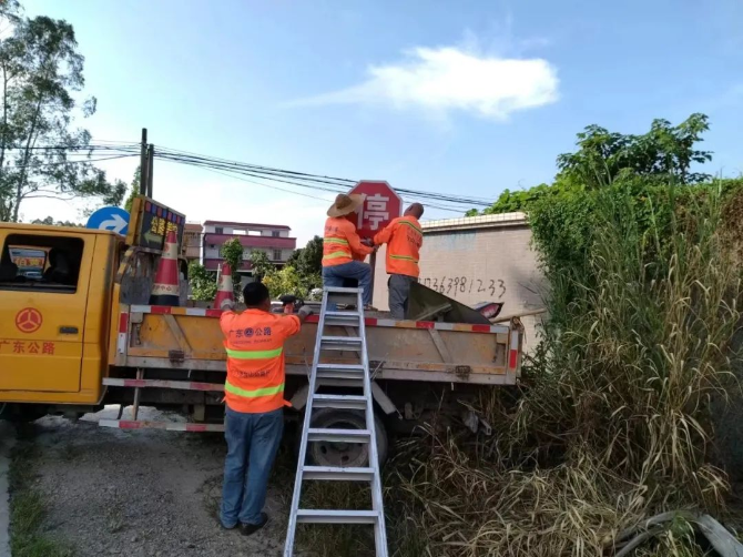 △9月28日,台山公路事务中心养护人员在G240线台山毓玉路口和那金路口开展交通标识维护工作,为广大人民群众节日出行提供安全舒适的通行环境。
