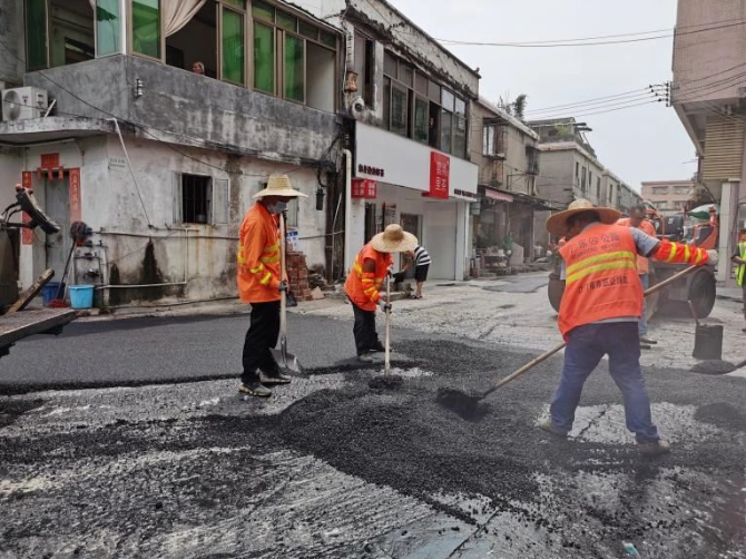 工程开展前,市区公路事务中心党员技术骨干多次到松岭村进行走访调研,反复勘察,实地会商,科学制定实施方案,会同陈斌等村干部与供电、供水等业务部门及时做好沟通协调工作,确保工程的顺利实施。7月24日起,村内多了一群橙色的身影,有的举着卡尺在放线、有的开铣刨机在凿毛路面、有的指挥摊铺机在摊铺沥青混凝土、有的驾驶压路机在压实路面——Y118线农村道路“白改黑”升级改造工程正式动工,全长450米,改造路面约4000平方米。市区公路事务中心20多名技术骨干顶住烈日高温在施工现场往来穿梭,摊铺机、压路机等多台大型机械开足马力,以大干、快干、实干的工作姿态推动工程于7月26日21时顺利完成。