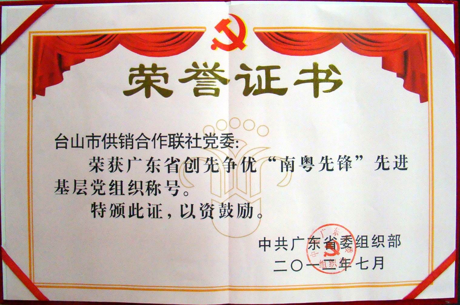 开展创造争优活动以来,该社通过“无为也是腐败”、思想大讨论、“四亮”等三项教育,有效地激发了干部职工的干事热情;通过建立“能上能下”的干部管理机制、述职点评机制、月度工作倒逼机制等三项机制,打造了专业的创业队伍;通过做好示范种植、技术下乡、搞活农产品流通等三项服务,切实增加了农民收入;通过打造农产品流通平台、“农超对接”平台、职业培训平台等三大平台,实现了供销事业突破创新。该社先后获得“全国县级供销合作社综合改革试点”、“广东省供销社系统综合业绩优胜单位特等奖”、“江门市、台山市红旗基层党组织”等荣誉称号。属下的广东厨艺学院还成为国内首家美国中餐厨师训练基地,被国家人力资源和社会保障部授予“技能人才培育突出贡献奖”,被评为“全国职工教育培训示范点”。