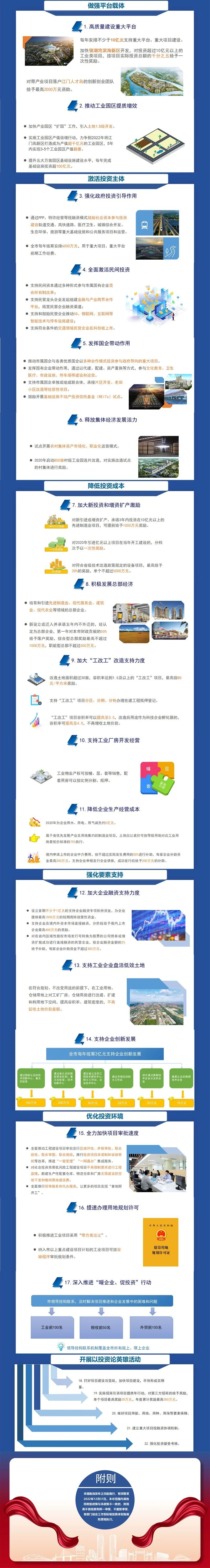 《若干措施》坚持问题导向,聚焦高质量发展难点、企业需求呼声等,着力解决投资痛点堵点,提出了22条政策措施,具有目标明确、覆盖面广、重点突出、支持力度大、针对性和可操作性强等特点,《若干措施》干货满满、诚意满满,体现了江门市积极扩大有效投资,激发社会创造力和市场活力的决心和力度。