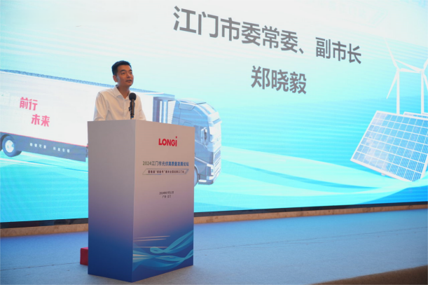 7月11日,我市举行2024江门市光伏高质量发展活动暨隆基"绿能号"展车全国巡展江门站。本次活动邀请了广东省太阳能行业协会秘书长沈贞文等光伏行业领域专家学者就江门市光伏产业高质量发展问题进行深入交流与探讨,对鹤山即将投产的隆基BC产品的实践情况和本地分布式光伏应用场景成果进行展示,推进企业间交流合作,促进新能源安全高效利用和转型发展。市委常委、副市长郑晓毅出席活动。
