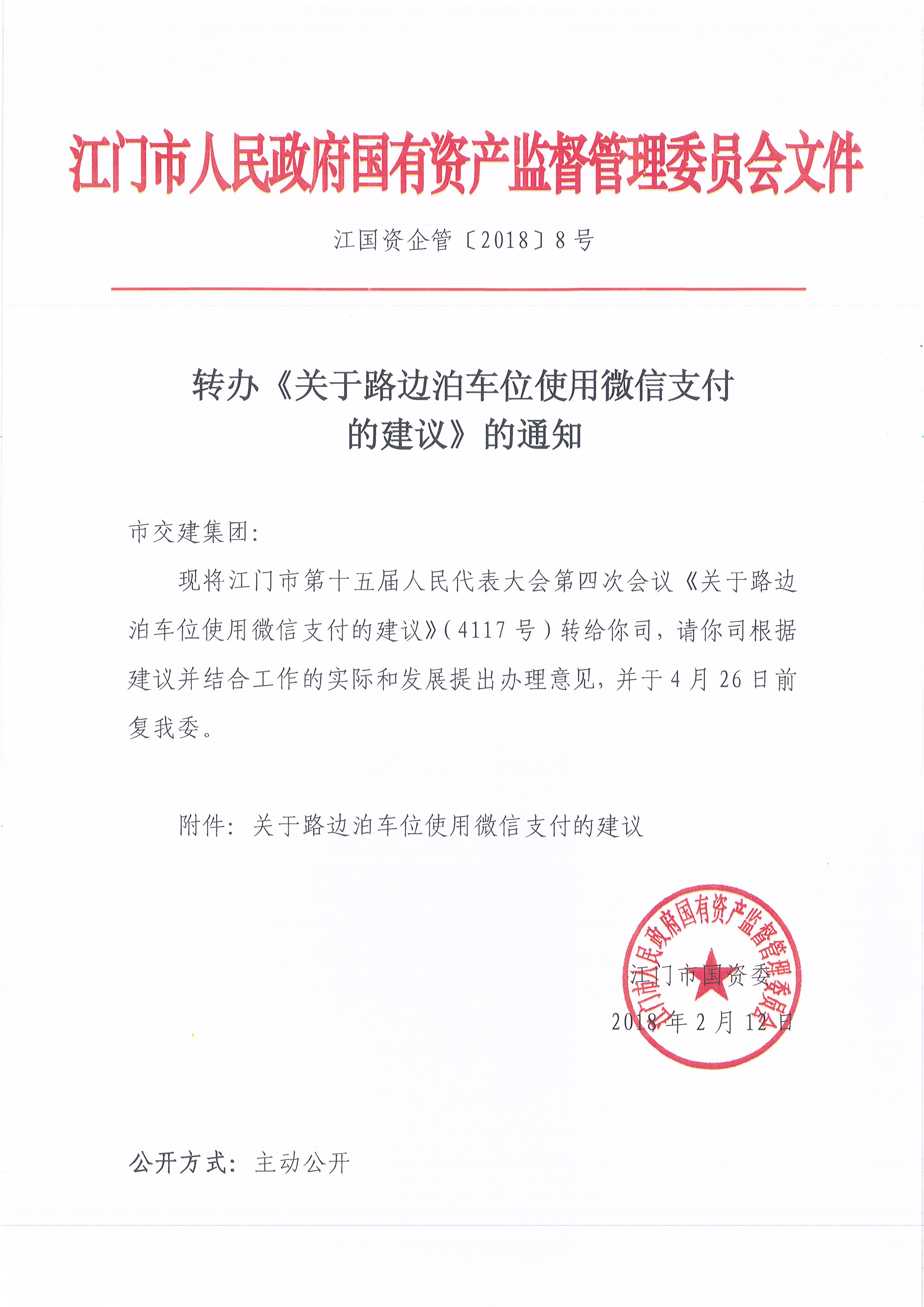 转办《关于路边泊车位使用微信支付的建议》的通知_通知公告_江门市国资委