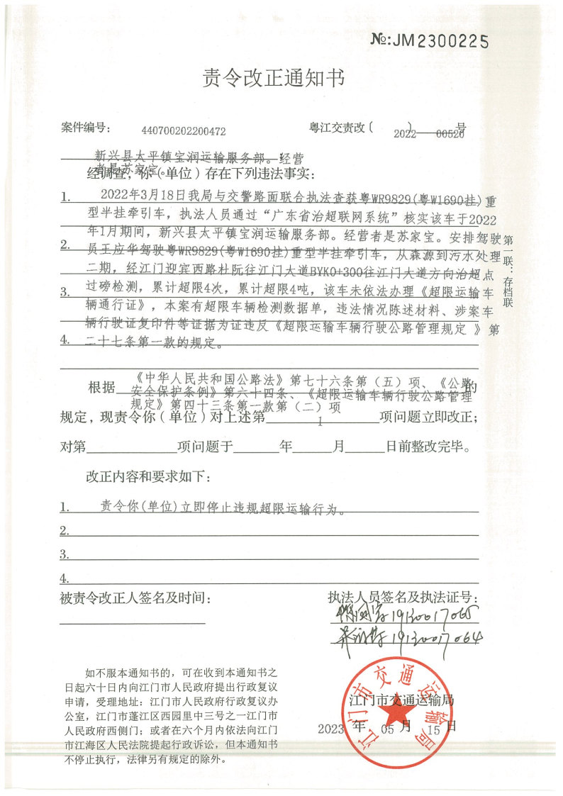 你(单位)因违反交通运输行政管理法规,本机关已作出行政处罚决定和责令改正通知书(具体内容详见附件)。依照《中华人民共和国民事诉讼法》第九十二条的规定,因受送达人采用其他方式无法送达,现向你(单位)公告送达《行政处罚决定书》和《责令改正通知书》。自公告之日起,经过30日即视为送达。